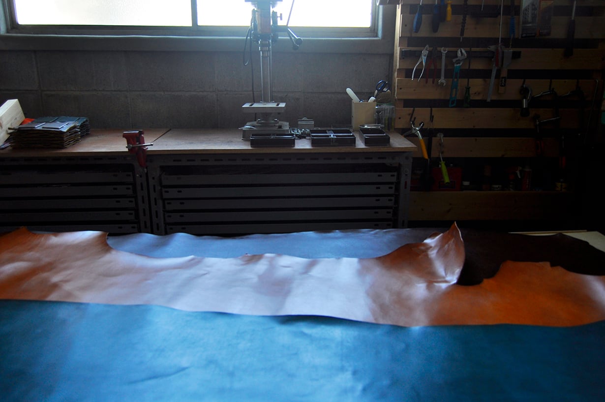 第一弾は革絞りという革の立体成型を生かしたアイテムを展開します。3Dデータを入力、CNC(自動フライス盤)によって精密な型を切削し、雄型と雌型で革をプレスすることで立体的に成型しています。ヌメ革を水で濡らし、型でプレスしてそのまま半日ほど固定し、型から外して自然乾燥するというたいへん時間を要する手法です。そのためあまり大量生産には向いていません。